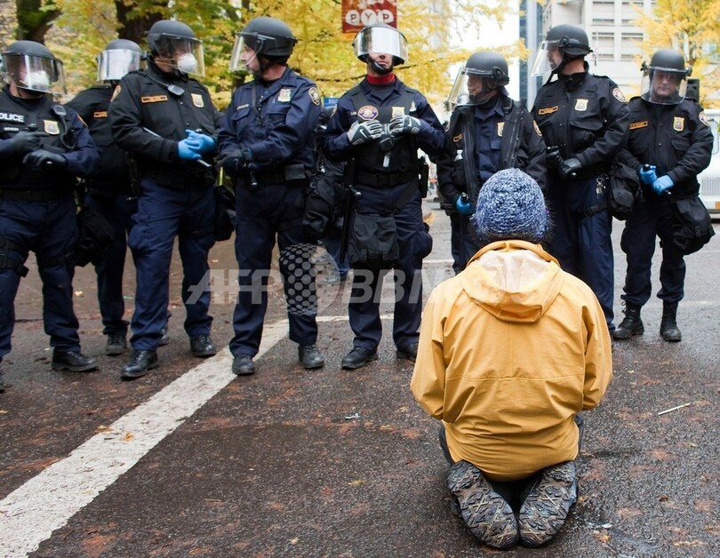 【11月14日 AFP】全米に拡大している抗議行動「オキュパイ・ウォールストリート(Occupy Wall Street、ウォール街を占拠せよ)」に共鳴してオレゴン(Oregon)州ポートランド(Portland)中心部の広場や公園を占拠していた「オキュパイ・ポートランド(Occupy Portland)」の参加者が13日、警察によって強制排除され、50人を超える逮捕者が出た。