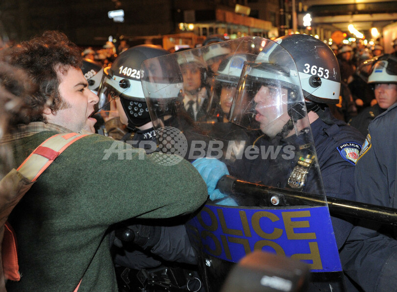 【11月15日 AFP】米ニューヨーク(New York)市警察は15日未明、全米数都市や世界各地に広がった反ウォール街(金融街)デモ「オキュパイ(占拠せよ)」運動の象徴的な中心地となっていたズコッティ公園(Zuccotti Park)に突入してデモ隊を排除し、設営されていたテントを撤去した。市当局は、一時的な退去措置だとしている。