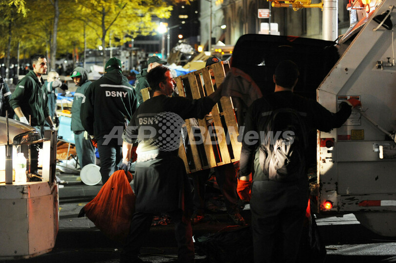 ニューヨークのマイケル・ブルームバーグ(Michael Bloomberg)市長の事務所はツイッター(Twitter)で、「ズコッティ公園の占拠をしている者は一時的に退去し、テントや防水シートを撤去しなさい。公園の清掃が終われば、デモ参加者たちはまた公園に戻ることができる」と呼びかけていた。