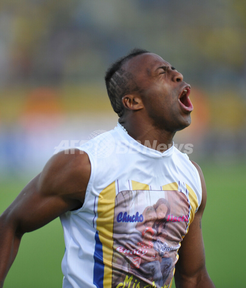 後半44分にチーム2得点目を挙げて歓喜するエクアドルのクリスチャン・ベニテス(Christian Benitez、2011年11月15日撮影)。(c)AFP/RODRIGO BUENDIA
