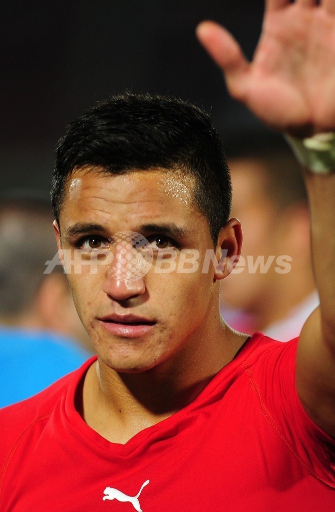 試合後、声援に応えるチリのアレクシス・サンチェス(Alexis Sanchez、2011年11月15日撮影)。(c)AFP/CLAUDIO SANTANA