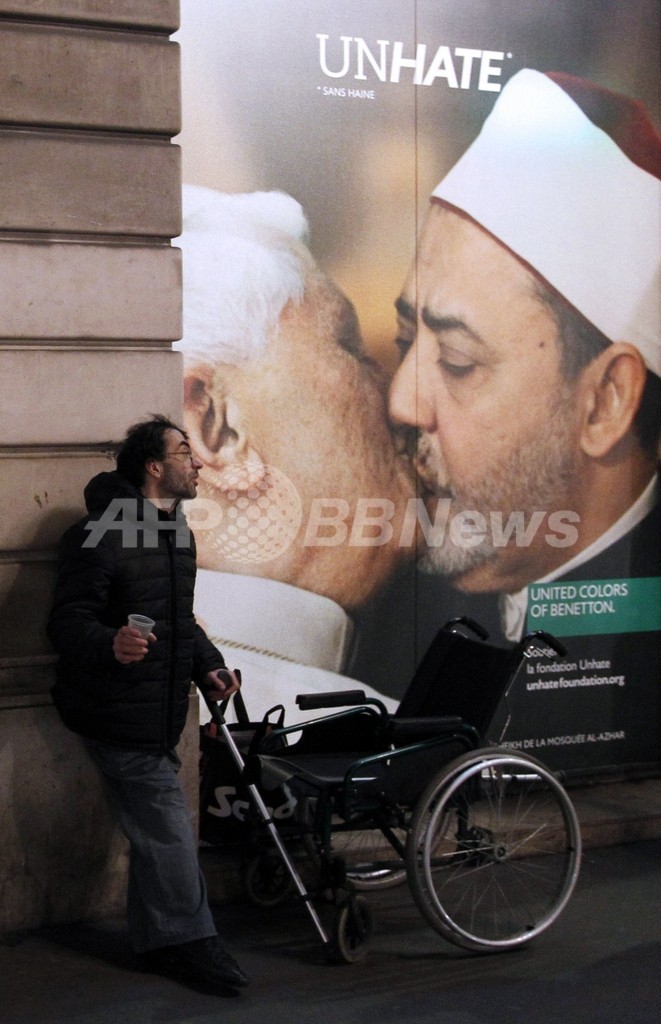 【11月17日 AFP】16日に新たなグローバルキャンペーン「UNHATE(反・憎悪)」の展開を始めた伊アパレルブランド「ベネトン(Benetton)」は同日、ローマ法王庁からの強い抗議を受け、ローマ法王ベネディクト16世(Pope Benedict XVI)とイスラム教の有力指導者とのキスシーンの合成写真を撤去した。