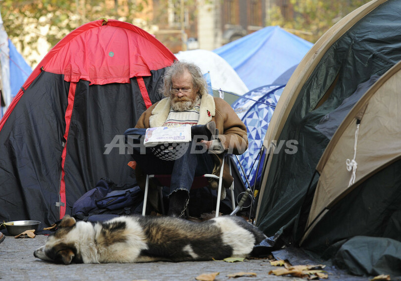 市は、これらのテントについて「通行を不法に妨げている」と批判し、17日午後6時(日本時間18日午前3時)までに全て撤去するよう告げる退去命令を各テントに掲示した。デモ隊側は、期限以降も座り込みを継続する意向を表明している。(c)AFP/Danny Kemp