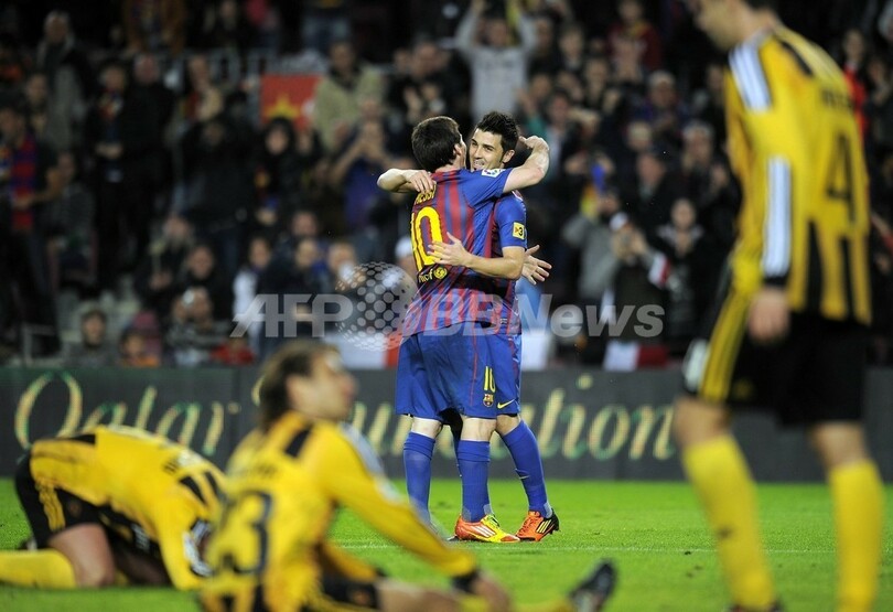 得点を挙げて歓喜するバルセロナのダビド・ビジャ(David Villa、右)とリオネル・メッシ(Lionel Messi、2011年11月19日撮影)。(c)AFP/LLUIS GENE
