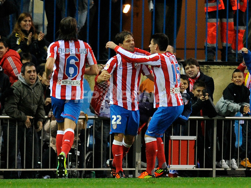 後半38分にチーム3得点目を挙げ、チームメイトに祝福されるアトレティコ・マドリードのジエゴ・リバス(Diego Ribas、2011年11月20日撮影)。(c)AFP/DANI POZO