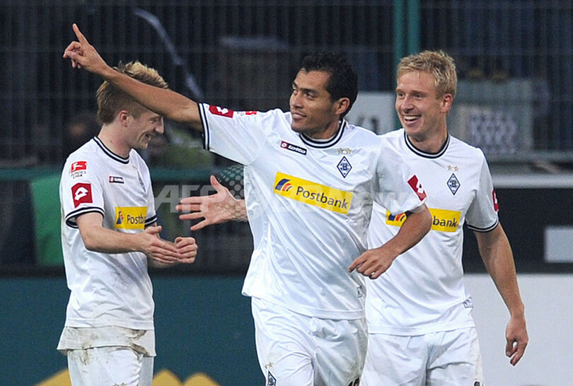 ゴールを決め歓喜するボルシア・メンヘングラッドバッハのフアン・アランゴ(Juan Arango、中央、2011年11月19日撮影)。(c)AFP/PATRIK STOLLARZ