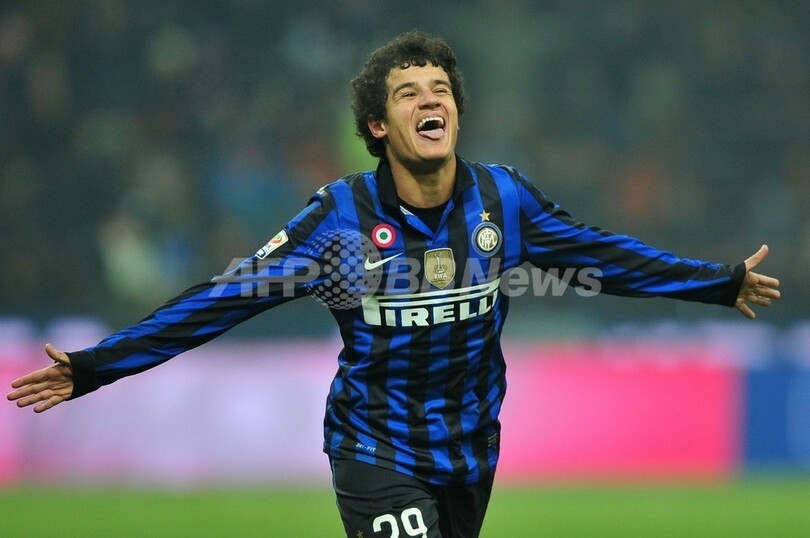 ゴールを決め、歓喜するインテルのフィリペ・コウチーニョ・コレイア(Philippe Coutinho Correia、2011年11月19日撮影)。(c)AFP/GIUSEPPE CACACE