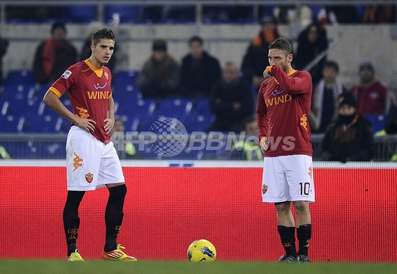 試合再開を待つASローマのエリク・ラメラ(Erik Lamela)とフランチェスコ・トッティ(Francesco Totti、2011年11月20日撮影)。(c)AFP/Filippo MONTEFORTE