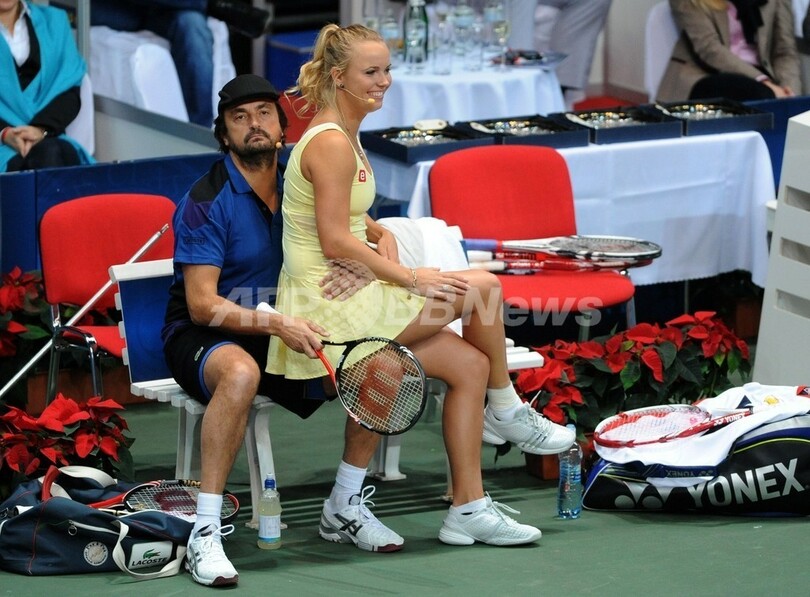 ダブルスでペアを組んだ元テニス選手のアンリ・ルコント(Henri Leconte)氏の足の上に座るカロリーネ・ボズニアツキ(2011年11月20日撮影)。(c)AFP/SAMUEL KUBANI