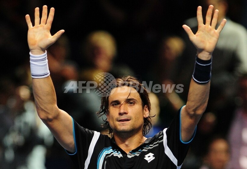試合に勝利し歓声に応えるダビド・フェレール(2011年11月21日撮影)。(c)AFP/LEON NEAL