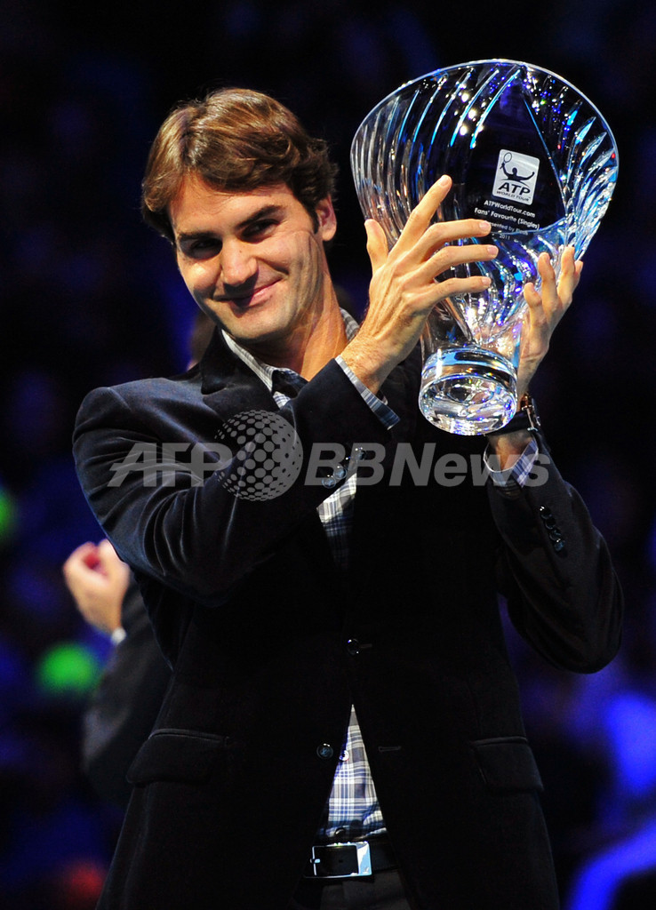 トロフィーを掲げるロジャー・フェデラー(2011年11月21日撮影)。(c)AFP/LEON NEAL