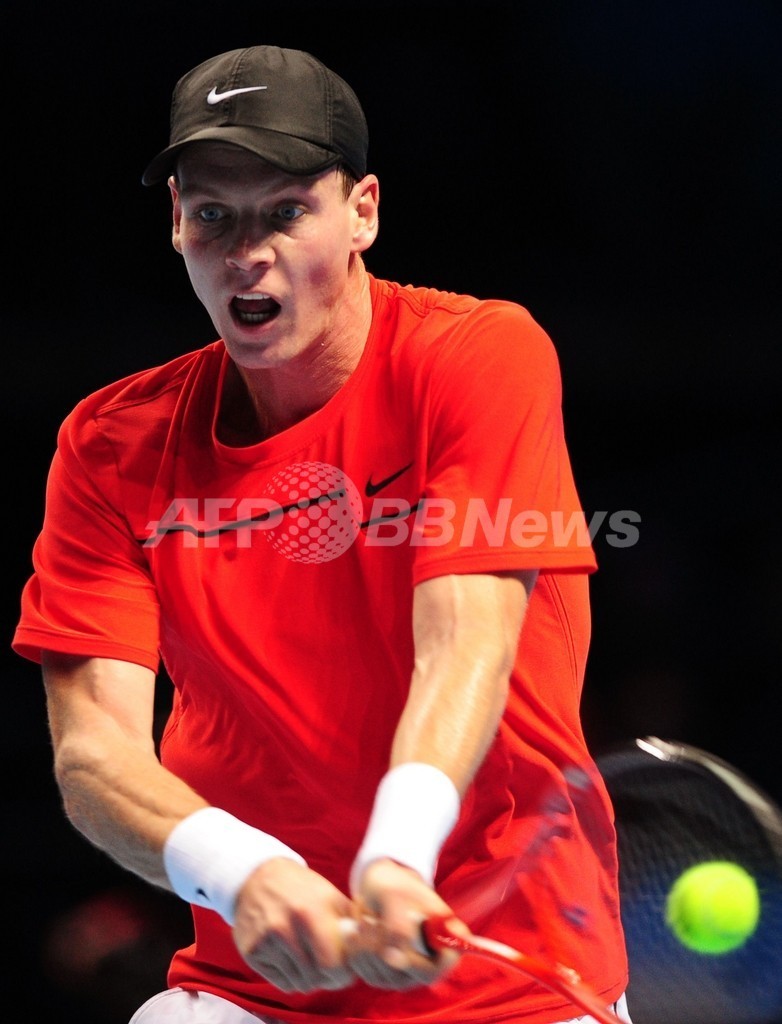 リターンを打つトマス・ベルディハ(2011年11月21日撮影)。(c)AFP/LEON NEAL