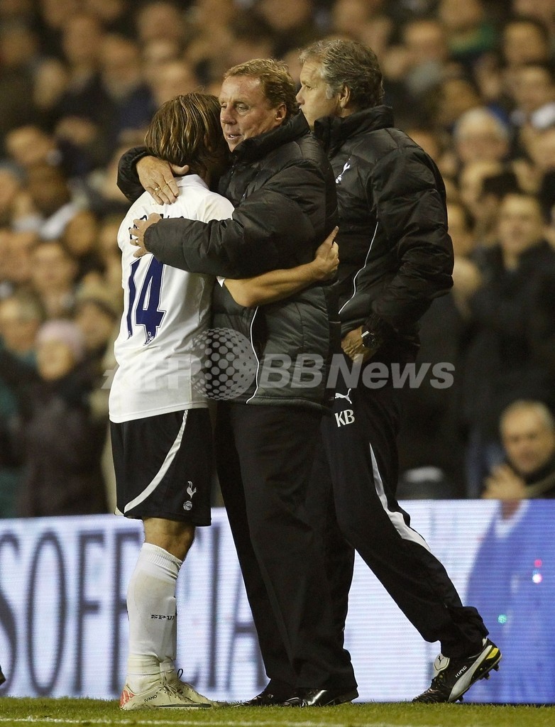ベンチに退いたルカ・モドリッチ(Luka Modric)を出迎えるトッテナム・ホットスパーのハリー・レドナップ監督(2011年11月21日撮影)。(c)AFP/IAN KINGTON