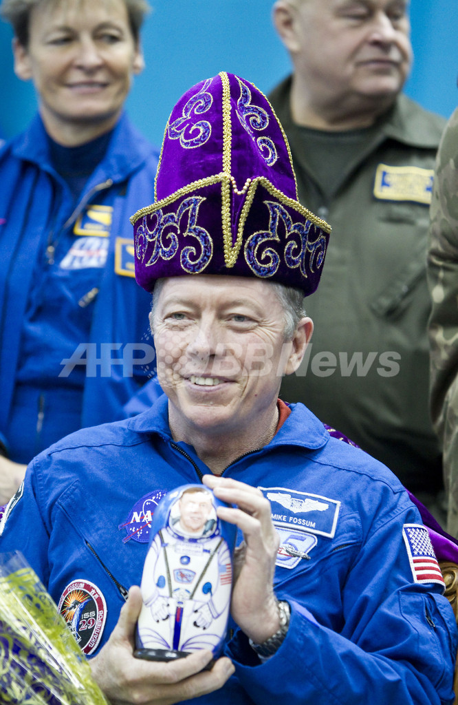 写真は帰還後にカザフスタン・コスタナイ(Kostanay)で開かれた記者会見で、同国の民族衣装の帽子をかぶり、ロシアの民芸人形「マトリョーシカ」を手にする米国人のマイケル・フォッサム(Mike Fossum)宇宙飛行士(2011年11月22日撮影)。(c)AFP/SHAMIL ZHUMATOV