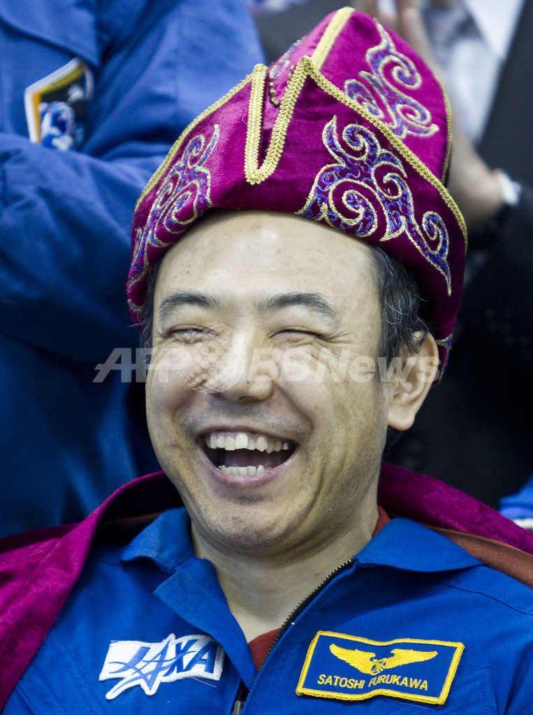 写真は帰還後にカザフスタン・コスタナイ(Kostanay)で開かれた記者会見に、同国の民族衣装の帽子をかぶって出席する古川さん(2011年11月22日撮影)。(c)AFP/SHAMIL ZHUMATOV