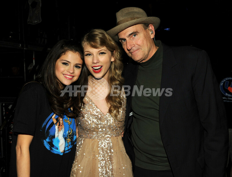 米歌手テイラー・スウィフト(Taylor Swift)が22日、米ニューヨーク(New York)のマディソンスクエアガーデン(Madison Square Garden)で公演を行い、「スピーク・ナウ(Speak Now)」ワールド・ツアーの北米編を締めくくった。写真は、同公演で共演したセレナ。ゴメス(Selena Gomez、左)、ジェームス・テイラー(James Taylor、右)と記念撮影を行ったスウィフト(2011年11月22日撮影)。(c)AFP/Getty Images/Larry Busacca