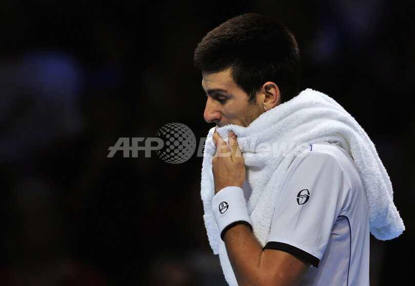 タオルで汗を拭うノバク・ジョコビッチ(2011年11月25日撮影)。(c)AFP/GLYN KIRK