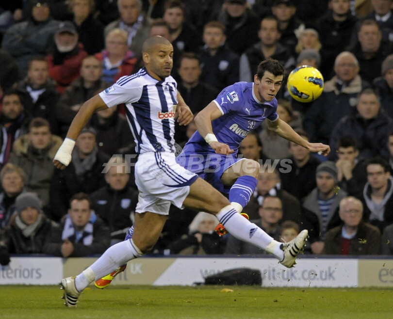 WBAのスティーブン・リード(Steven Reid、左)と競りながらクロスボールを上げるトッテナム・ホットスパーのギャレス・ベイル(Gareth Bale、2011年11月26日撮影)。(c)AFP/OLLY GREENWOOD