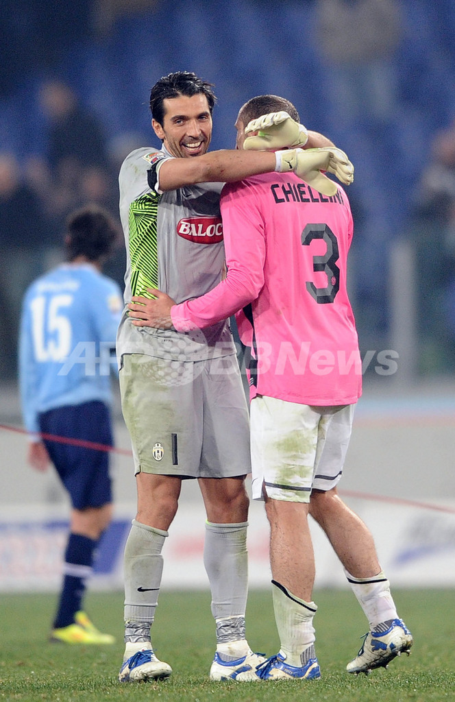 試合に勝利し、チームメイトのジョルジョ・キエッリーニ(Giorgio Chiellini、右)と歓喜するユベントスのGKジャンルイジ・ブッフォン(Gianluigi Buffon、2011年11月26日撮影)。(c)AFP/VINCENZO PINTO