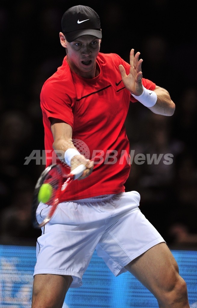 リターンを打つトマス・ベルディハ(2011年11月26日撮影)。(c)AFP/GLYN KIRK