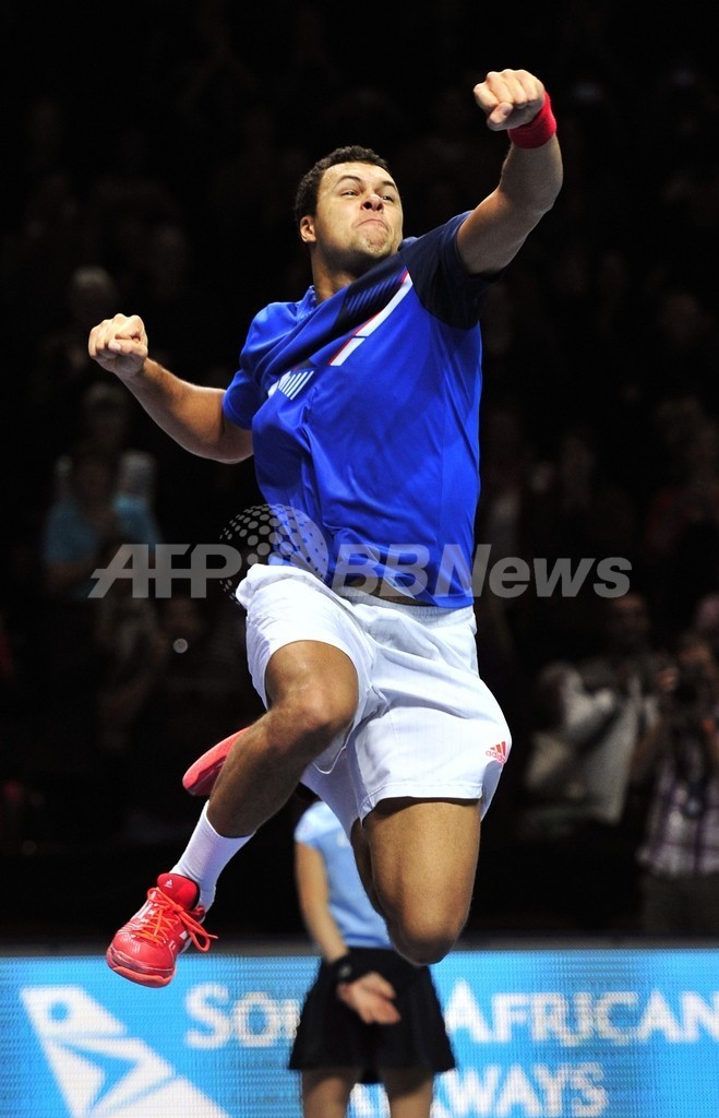 試合に勝利し、歓喜するジョーウィルフリード・ツォンガ(2011年11月26日撮影)。(c)AFP/GLYN KIRK