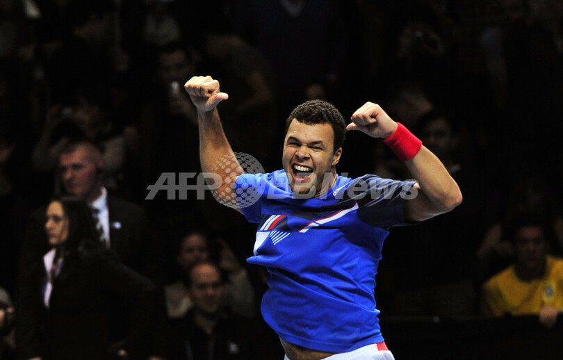 試合に勝利し、歓喜するジョーウィルフリード・ツォンガ(2011年11月26日撮影)。(c)AFP/GLYN KIRK