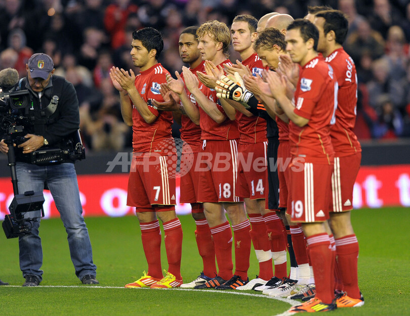 試合開始前、死去したウェールズ代表のガリー・スピード(Gary Speed)監督に黙祷を捧げ、拍手を送るリバプールの選手(2011年11月27日撮影)。(c)AFP/PAUL ELLIS