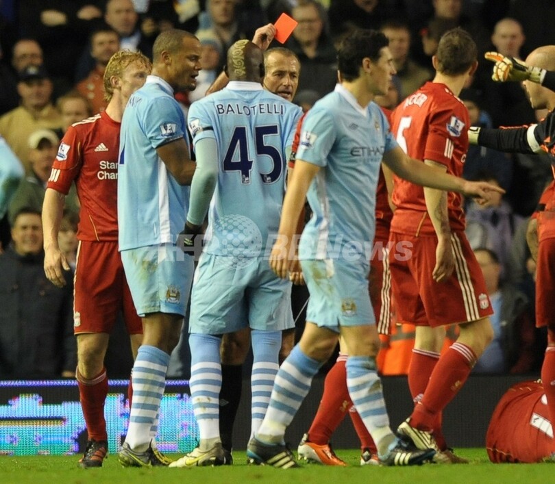 後半37分、マーティン・アトキンソン主審(Martin Atkinson、中央奥)からレッドカードを受けるマンチェスター・シティのマリオ・バロテッリ(Mario Balotelli、中央手前、2011年11月27日撮影)。(c)AFP/PAUL ELLIS