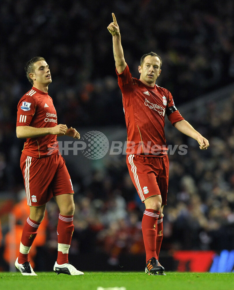 前半33分、マンチェスター・シティのジョレオン・レスコット(Joleon Lescott、写真外)のオウンゴールを喜ぶリバプールのチャーリー・アダム(Charlie Adam、右、2011年11月27日撮影)。(c)AFP/PAUL ELLIS