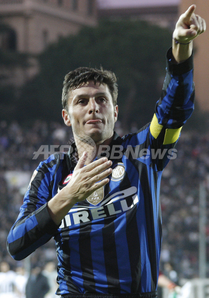 勝利の喜びをサポーターと分かち合うインテルのクリスティアーノ・ザネッティ(Cristiano Zanetti、2011年11月27日撮影)。(c)AFP/FABIO MUZZI