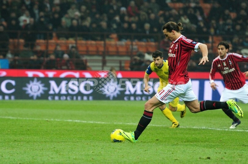 ペナルティーキックから得点を挙げるACミランのズラタン・イブラヒモビッチ(Zlatan Ibrahimovic、中央、2011年11月27日撮影)。(c)AFP/GIUSEPPE CACACE