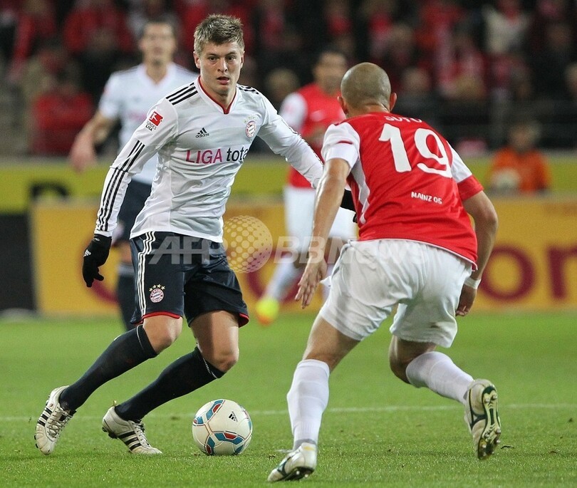 マインツ05のエルキン・ソト(Elkin Soto、右)とボールを競るバイエルン・ミュンヘンのトニ・クロース (Toni Kroos、2011年11月27日撮影)。(c)AFP/DANIEL ROLAND
