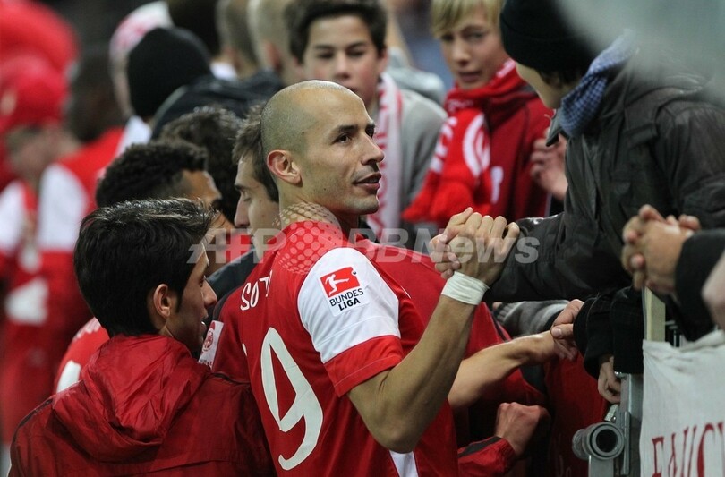 勝利をサポーターと喜ぶマインツ05のエルキン・ソト(Elkin Soto、中央、2011年11月27日撮影)。(c)AFP/DANIEL ROLAND