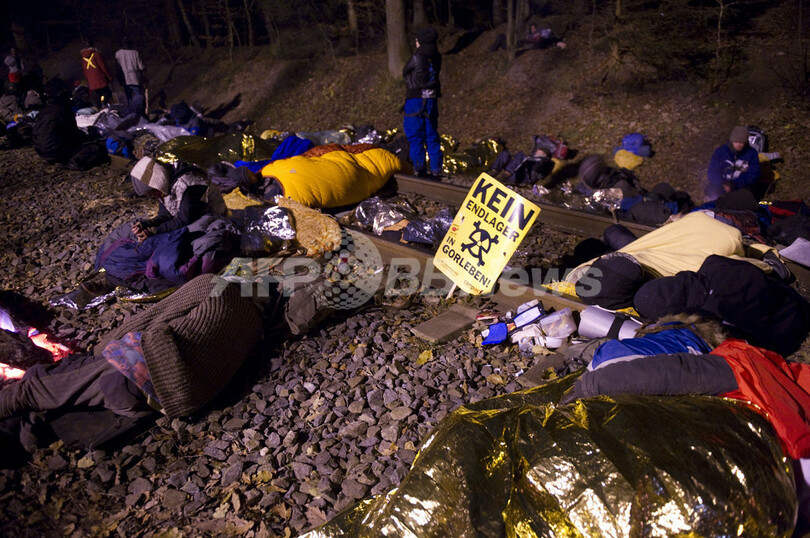 デモ隊は、使用済み燃料棒を列車で輸送するのは危険だと批判。また、数千年後まで危険な放射性廃棄物を恒久的に保管する施設は、欧州各国と同様、ドイツ国内にはないと訴えている。(c)AFP/Frederic Happe
