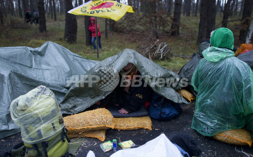デモ隊は、使用済み燃料棒を列車で輸送するのは危険だと批判。また、数千年後まで危険な放射性廃棄物を恒久的に保管する施設は、欧州各国と同様、ドイツ国内にはないと訴えている。(c)AFP/Frederic Happe