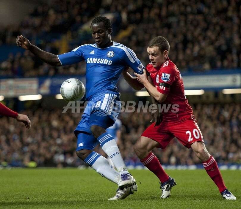 ボールを競るチェルシーのロメルー・ルカク(Romelu Lukaku、左)とリバプールのジェイ・スピアリング(Jay Spearing、2011年11月29日撮影)。(c)AFP/ADRIAN DENNIS