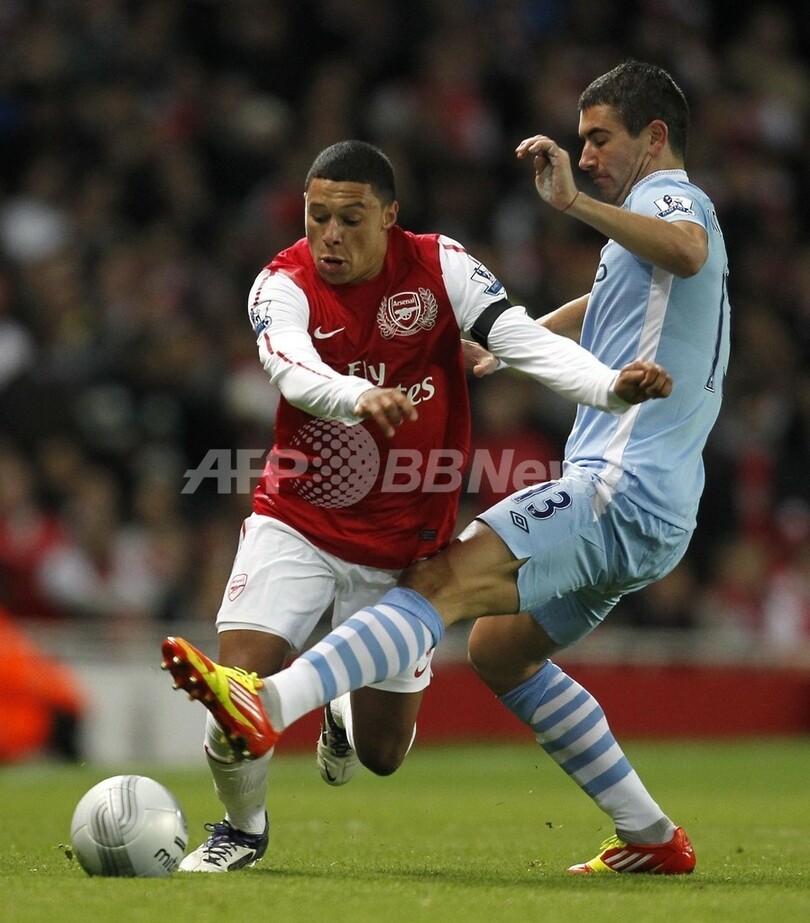 ボールを競るアーセナルのアレックス・オックスレイド・チェンバレン(Alex Oxlade-Chamberlain、左)とマンチェスター・シティのアレクサンダル・コラロフ(Aleksandar Kolarov、2011年11月29日撮影)。(c)AFP/IAN KINGTON