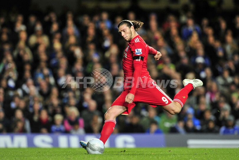 ペナルティーキック(PK)を蹴るリバプールのアンディー・キャロル(Andy Carroll、2011年11月29日撮影)。(c)AFP/ADRIAN DENNIS