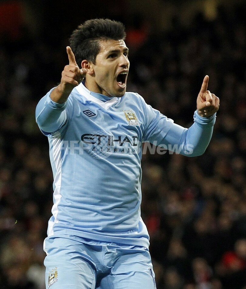 後半38分に先制ゴールを決め歓喜するマンチェスター・シティのセルヒオ・アグエロ(Sergio Aguero、2011年11月29日撮影)。(c)AFP/IAN KINGTON