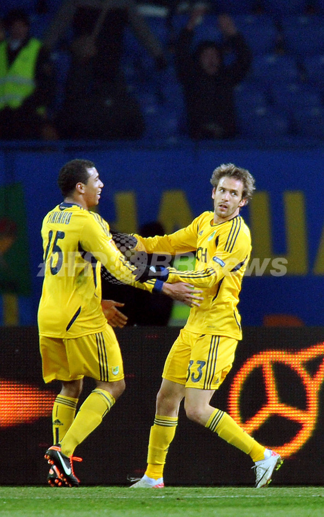 前半16分に先制点を挙げ、チームメイトのフィニーニョ(Fininho、左)と歓喜するメタリスト・キハルキフのマルコ・デヴィッチ(Marko Devic、2011年11月30日撮影。)(c)AFP/SERGEI SUPINSKY