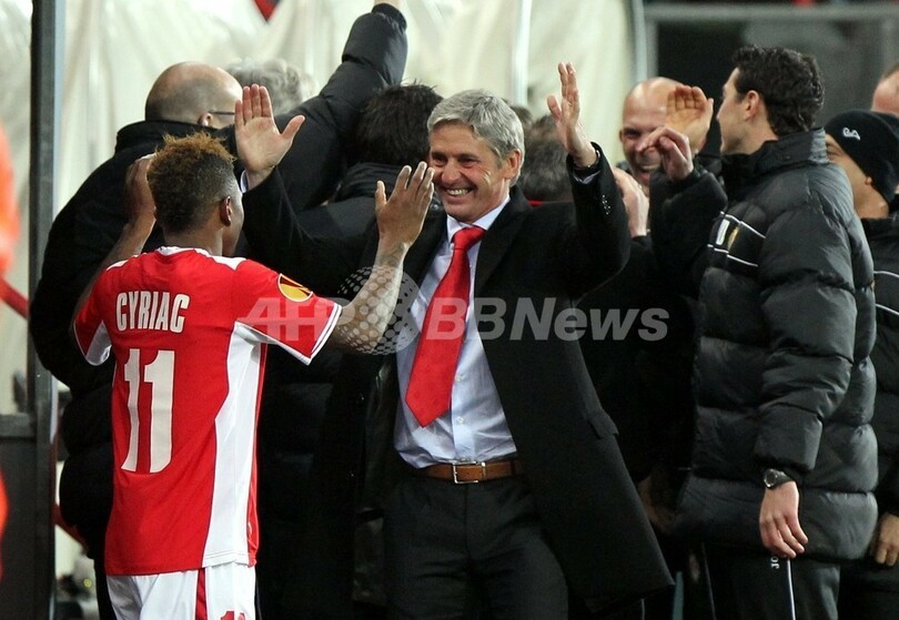 決勝トーナメント進出を決め、ゴイ・ビ・シリアク(Gohi Bi Cyriac、左)と歓喜するスタンダール・リエージュのジョゼ・リガ(Jose Riga)監督(2011年11月30日撮影)。(c)AFP/MICHEL KRAKOWSKI