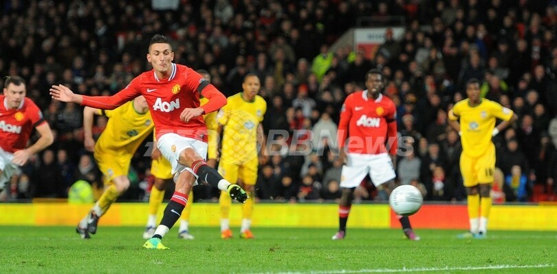 後半24分にペナルティーキック(PK)で同点ゴールを決めるマンチェスター・ユナイテッドのフェデリコ・マケダ(Federico Macheda、2011年11月30日撮影)。(c)AFP/ANDREW YATES