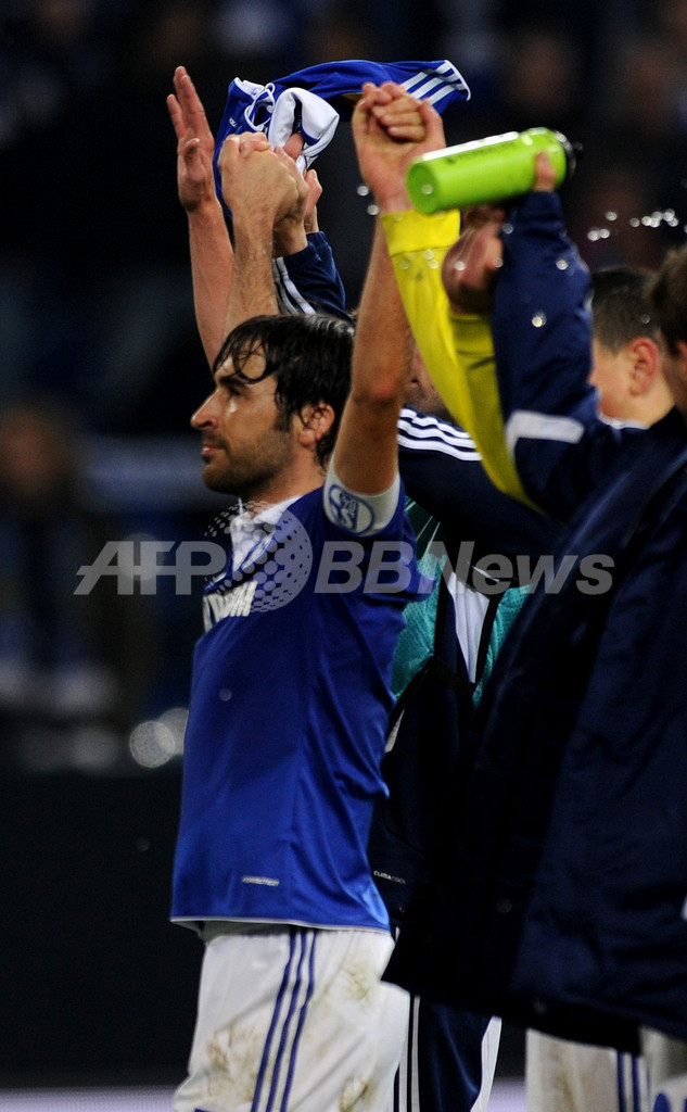 勝利を喜ぶシャルケ04のラウル・ゴンザレス(Raul Gonzalez、2011年12月1日撮影)。(c)AFP/PATRIK STOLLARZ