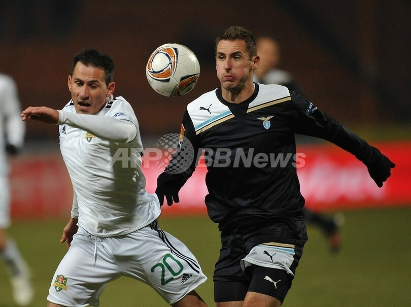 SCバスルイのジフコ・ミラノフ(Zhivko Milanov、左)とボールを競ラツィオのミロスラフ・クローゼ(Miroslav Klose、2011年12月1日撮影)。(c)AFP/DANIEL MIHAILESCU