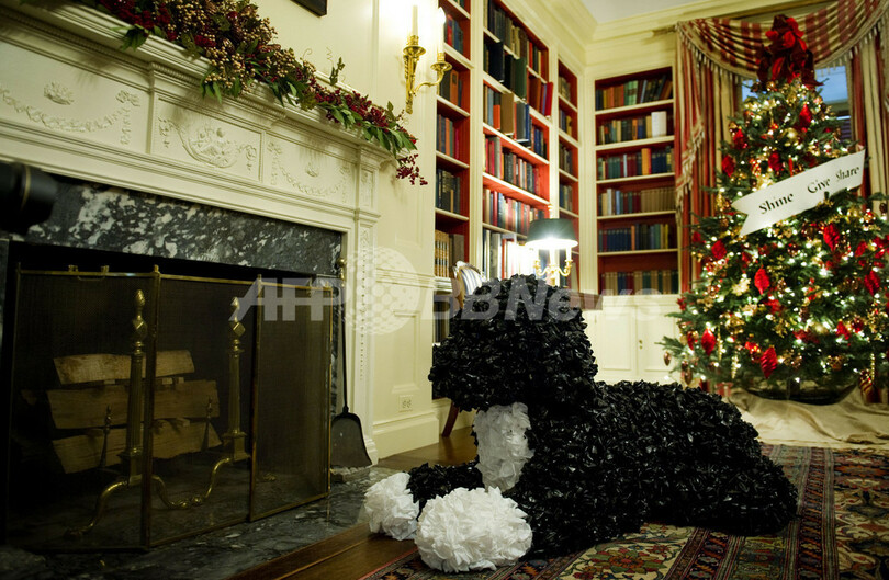 写真は、クリスマスの装飾がなされたホワイトハウスの図書室に飾られた、ゴミ袋で作られたオバマ一家の愛犬、ボーの人形(2011年11月30日撮影)。(c)AFP/Jim WATSON