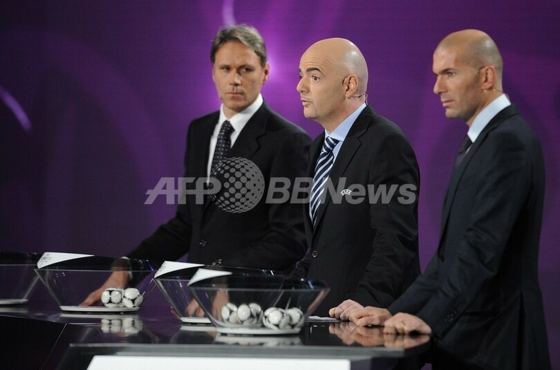 抽選会に望むの(左から)元オランダ代表のマルコ・ファン・バステン氏(Marco van Basten)、欧州サッカー連盟(Union of European Football Associations、UEFA)のジャンニ・インファンティーノ(Gianni Infantino)事務局長、元フランス代表のジネディーヌ・ジダン氏(Zinedine Zidane、2011年12月2日撮影)。(c)AFP/FRANCK FIFE