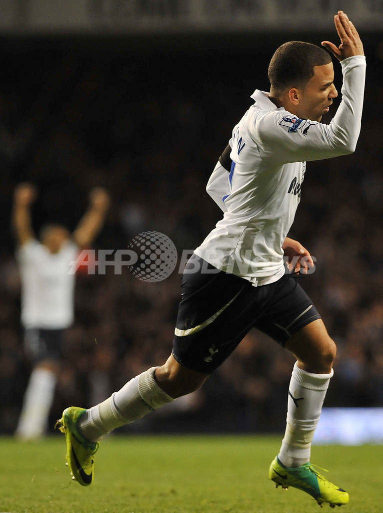 後半5分に追加点を挙げ、歓喜するトッテナム・ホットスパーのアーロン・レノン(Aaron Lennon、2011年12月3日撮影)。(c)AFP/BEN STANSALL