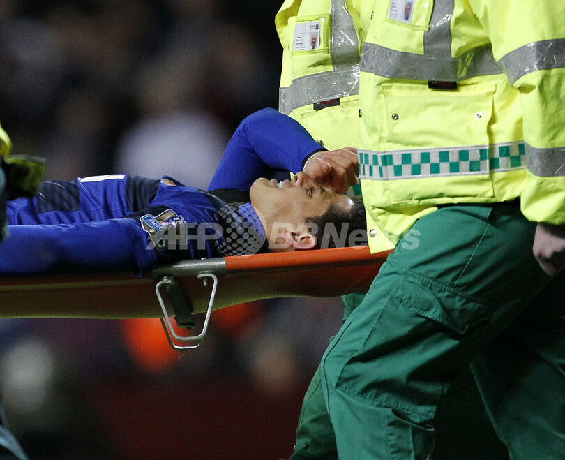 足首を負傷し、担架で運び出されるマンチェスター・ユナイテッドのハビエル・エルナンデス(Javier Hernandez、2011年12月3日撮影)。(c)AFP/IAN KINGTON