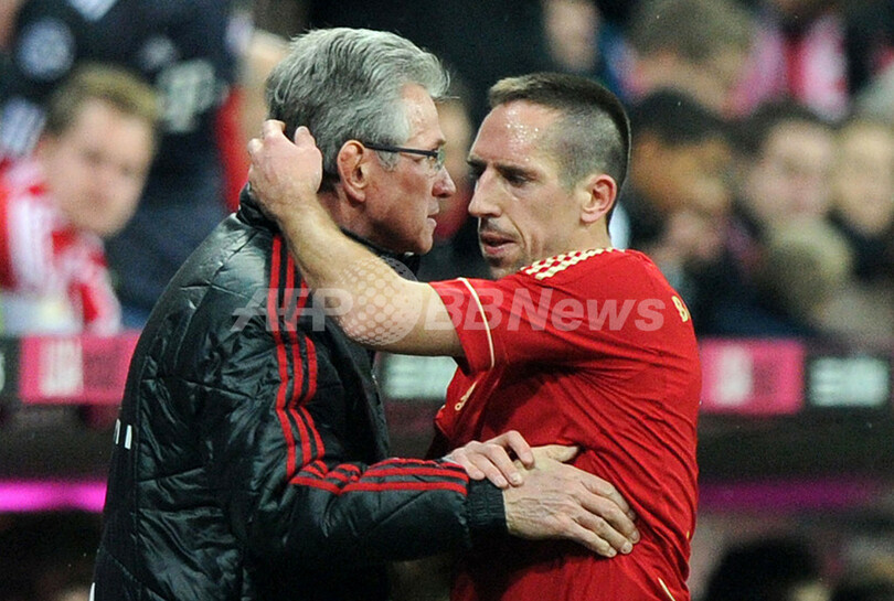 後半ロスタイムに選手交代でピッチを退き、ユップ・ハインケス(Jupp Heynckes、左)監督と抱き合うバイエルン・ミュンヘンのフランク・リベリ(Franck Ribery、2011年12月3日撮影)。(c)AFP/CHRISTOF STACHE