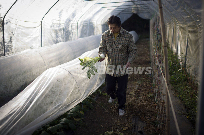 写真は農園で野菜を手にとる山下さん(2011年11月16日撮影)。(c)AFP/FRED DUFOUR